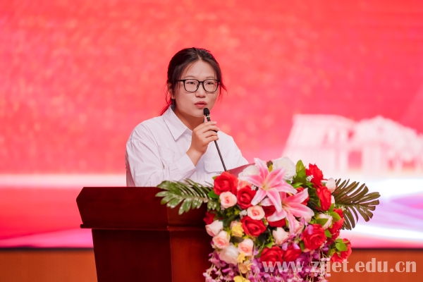 2024届毕业生代表、国家奖学金获得者蒋益姣发言。她回忆了宝贵的“经贸时光”,讲述了服务亚运会、参加技能竞赛等奋斗故事,表达了对学校和老师辛勤栽培的感恩之情。